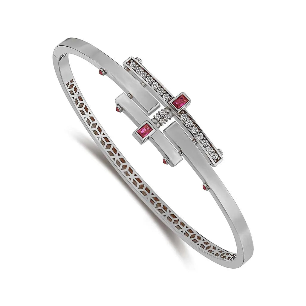 Pretínajúce sa línie vytvárajú harmonickú rovnováhu, zatiaľ čo kubické zirkóny v čírej a červenej farbe pridávajú dizajnu sofistikovaný kontrast.