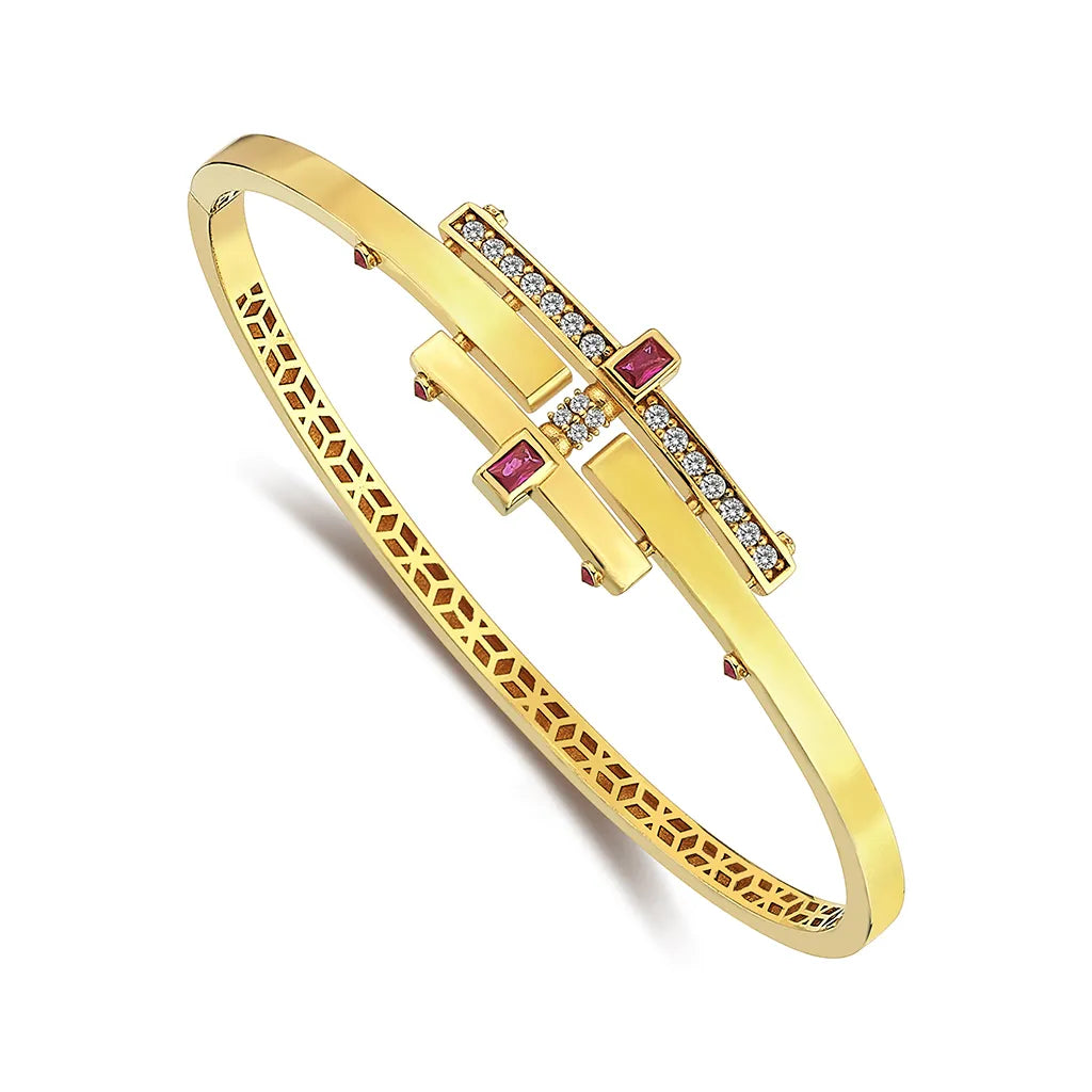 Vyrobený z 14-karátového žltého zlata (585/1000), tento pevný náramok (bangle) vyniká remeselným spracovaním, architektonickým dizajnom a nadčasovým štýlom.