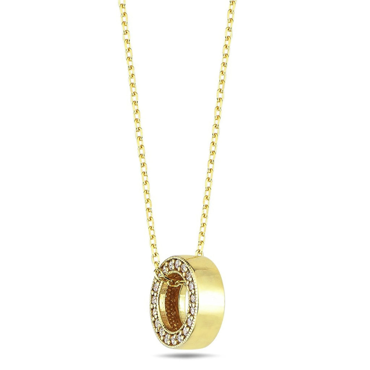 Discover an exceptional piece of jewelry from the CREYO AURA collection that combines elegance with modern expressiveness. This necklace made of 14-carat yellow gold (585/1000) is decorated with a massive circular pendant set with a row of sparkling zircons that create a radiant contrast with the smooth surface of the gold.