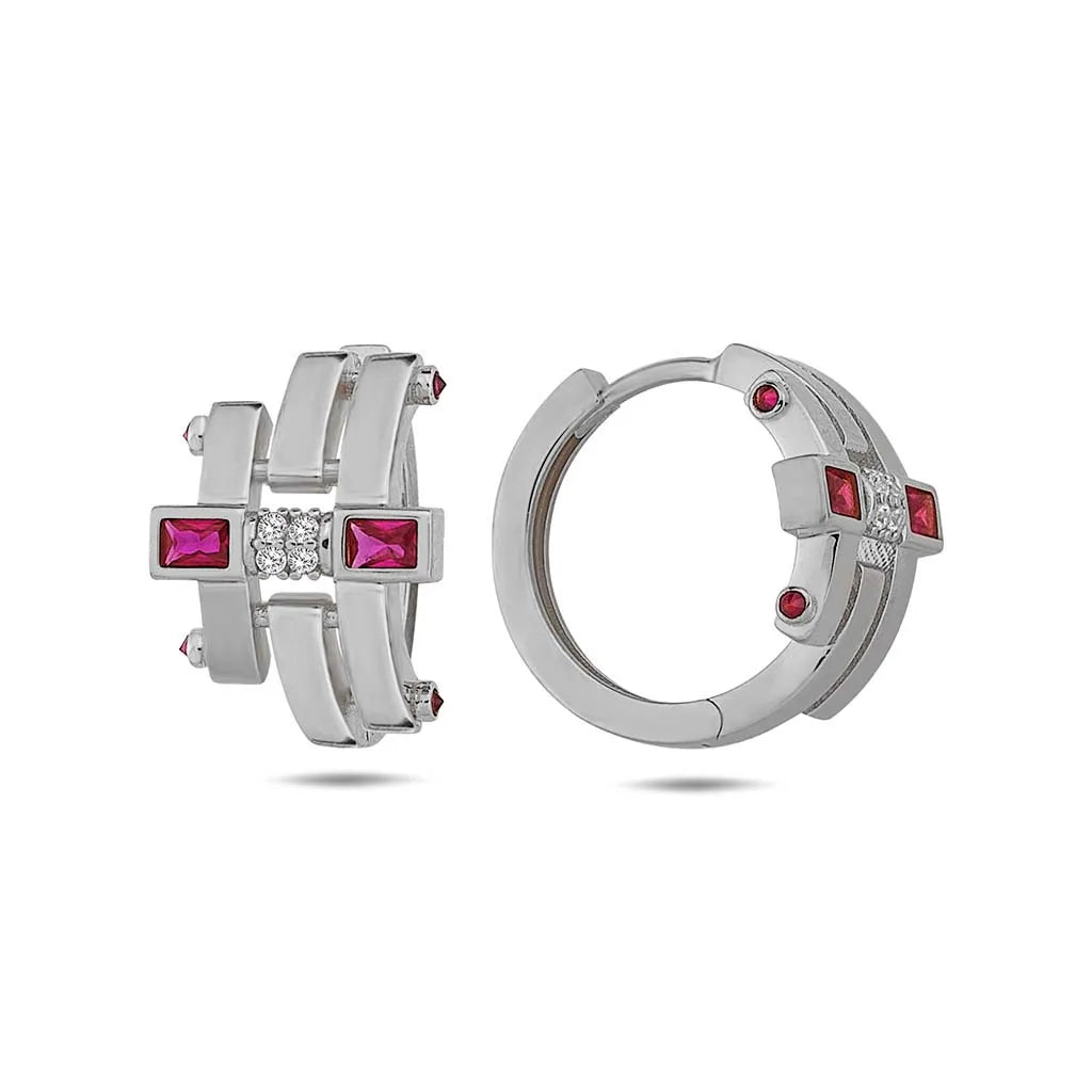 Pretínajúce sa línie dopĺňajú kubické zirkóny v čírej a červenej farbe, ktoré odrážajú svetlo s brilantným leskom.