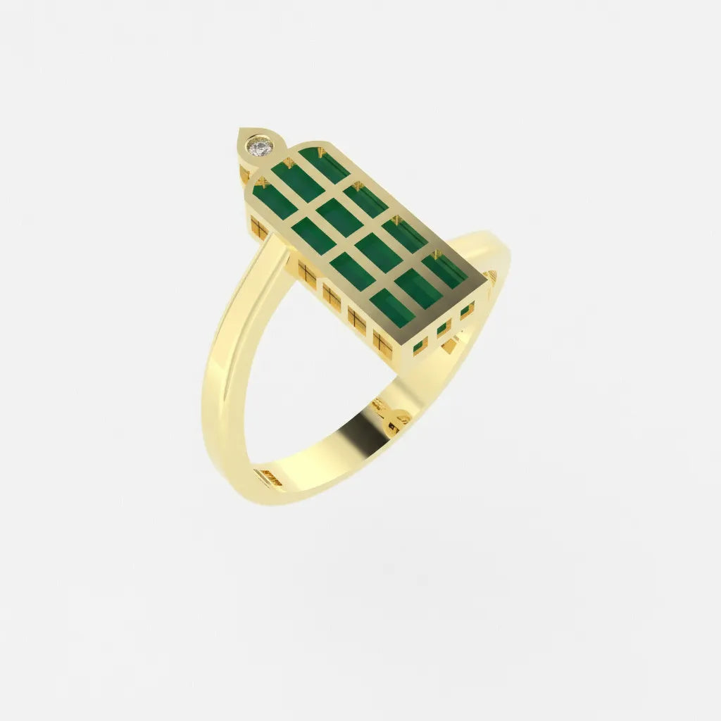 Každý lúč svetla, ktorý sa odrazí od hladkého povrchu zlata, zvýrazní hĺbku smaragdového tónu a jemnú geometriu okienka.